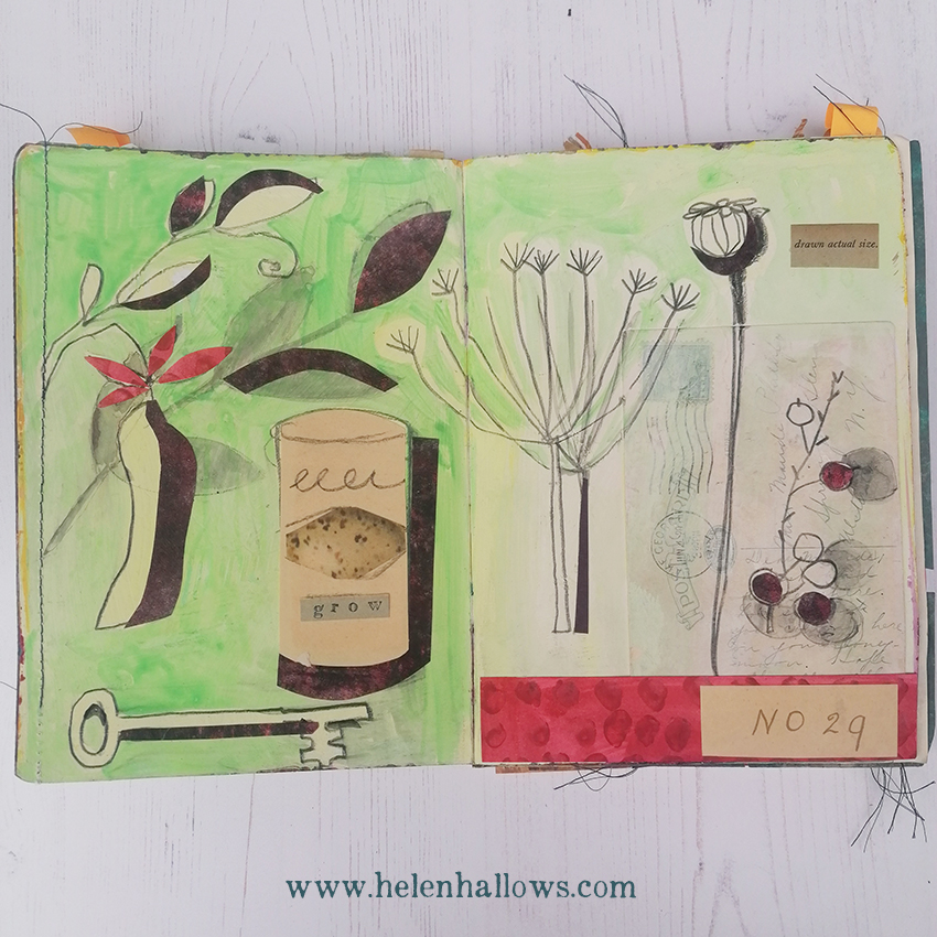 My sketchbooks are a meeting place for texture, mark, drawings and pattern, usually inspired by nature. I love to build the pages with these different elements.