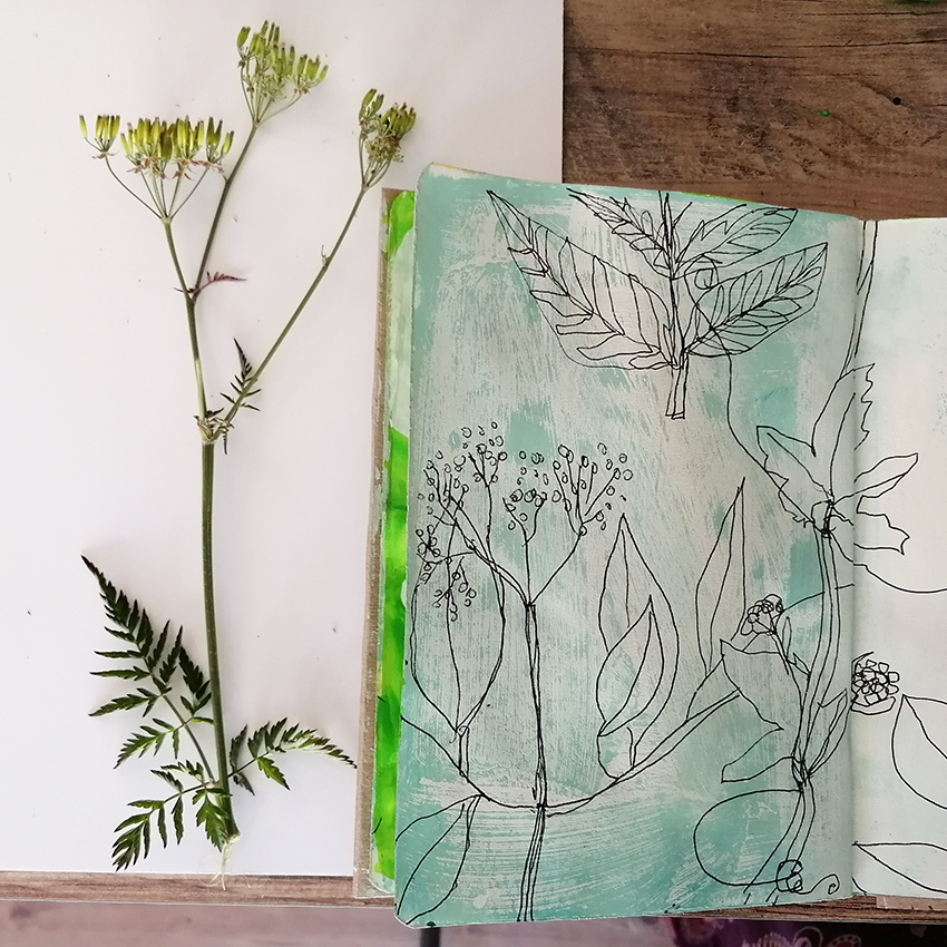 My sketchbooks are a meeting place for texture, mark, drawings and pattern, usually inspired by nature. I love to build the pages with these different elements.